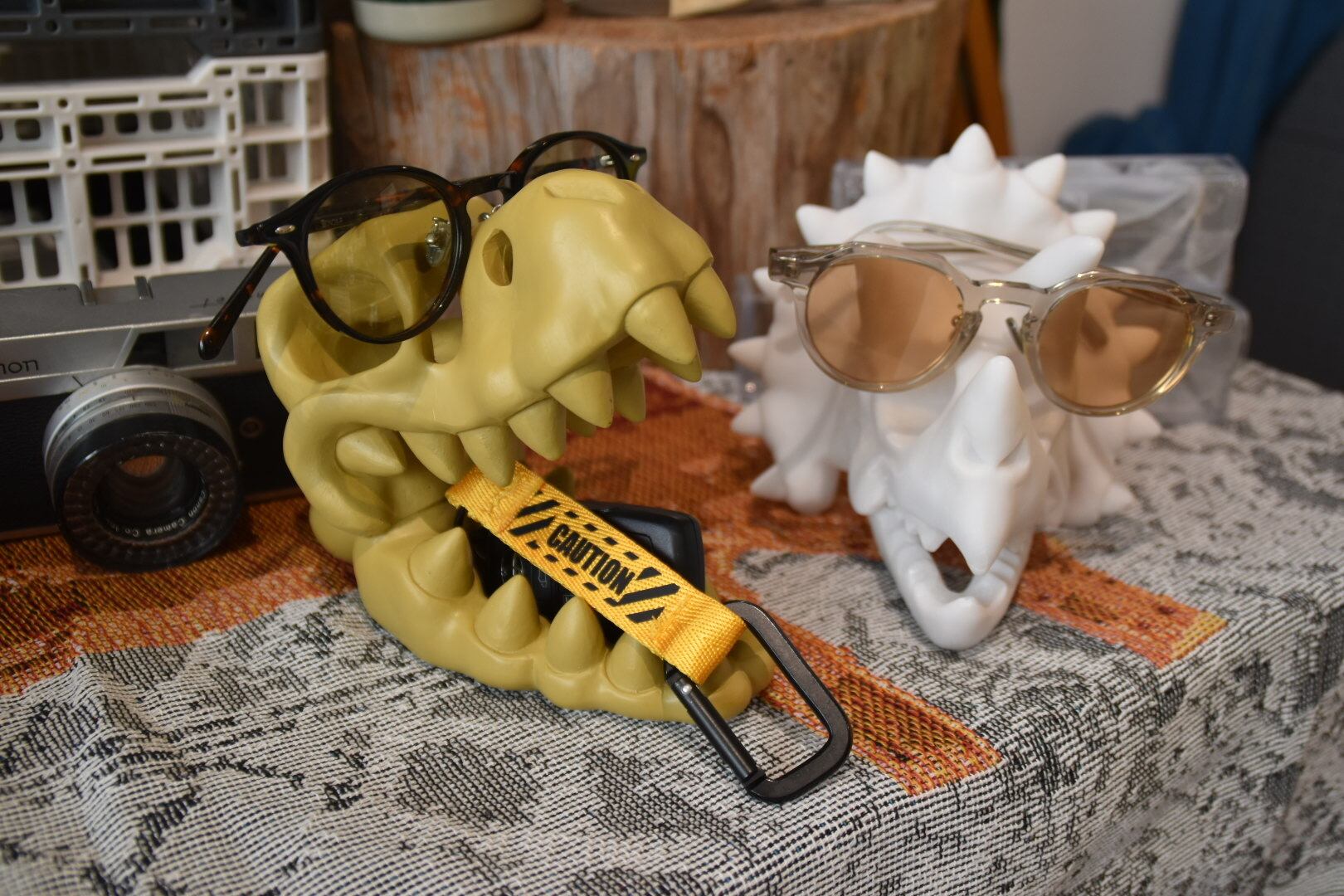 恐竜の骨をモチーフにした樹脂製のメガネホルダー。 オブジェとしても様になる大胆さと遊び心のあるアイテムです。 メガネ置きとしてはもちろん、角や歯をリングホルダーに見立てたり、空洞部分にペンを差し込んだり。 スケルトンの形状を活かして、型にはまらない使い方でお愉しみください。